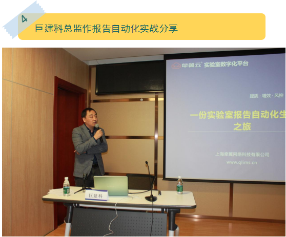 在随后的数字化实验室综合论坛上,上海牵翼网络科技有限公司总经理刘慧伟、国家电网中国电科院检验检测中心副总工程师黄华、北京中关村水木医疗检测技术有限公司副总经理齐丽晶、上海牵翼网络科技有限公司技术总监巨建科等专家,分别带来了实验室AI应用场景、电气领域实验室数字化实践、医疗器械LIMS系统的升级与客户链接、实验室原始记录和报告自动化实战等方面的深度洞察和经验分享。