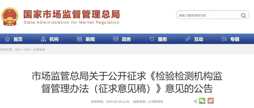 为深入贯彻落实党中央、国务院决策部署,进一步强化检验检测行业管理,规范检验检测市场秩序,促进行业持续健康发展,市场监管总局启动《检验检测机构监督管理办法》修订工作,组织起草了《检验检测机构监督管理办法(征求意见稿)》,现向社会公开征求意见。公众可通过以下途径和方式提出意见:
