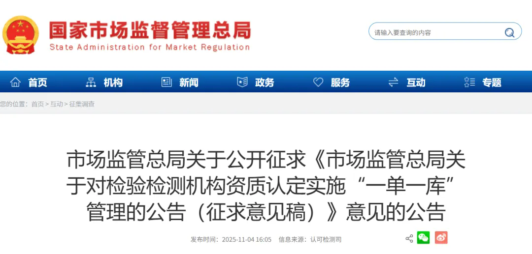 为加快构建全国统一大市场,深化检验检测机构资质认定制度改革,严格依法行政,进一步优化审批服务,市场监管总局起草了《市场监管总局关于对检验检测机构资质认定实施“一单一库”管理的公告(征求意见稿)》。现向社会公开征求意见,反馈意见截止日期为2025年12月4日。公众可通过以下途径和方式提出意见: