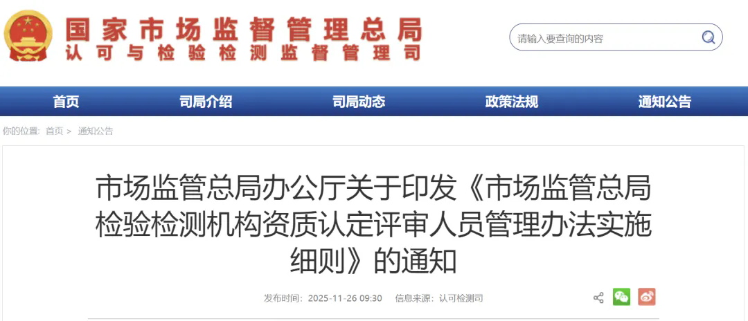 11月26日,市场监管总局办公厅印发《市场监管总局检验检测机构资质认定评审人员管理办法实施细则》,该细则适用于接受市场监管总局指派,承担资质认定技术评审工作的人员,包括资质认定主任评审员、资质认定评审员和资质认定评审技术专家。
