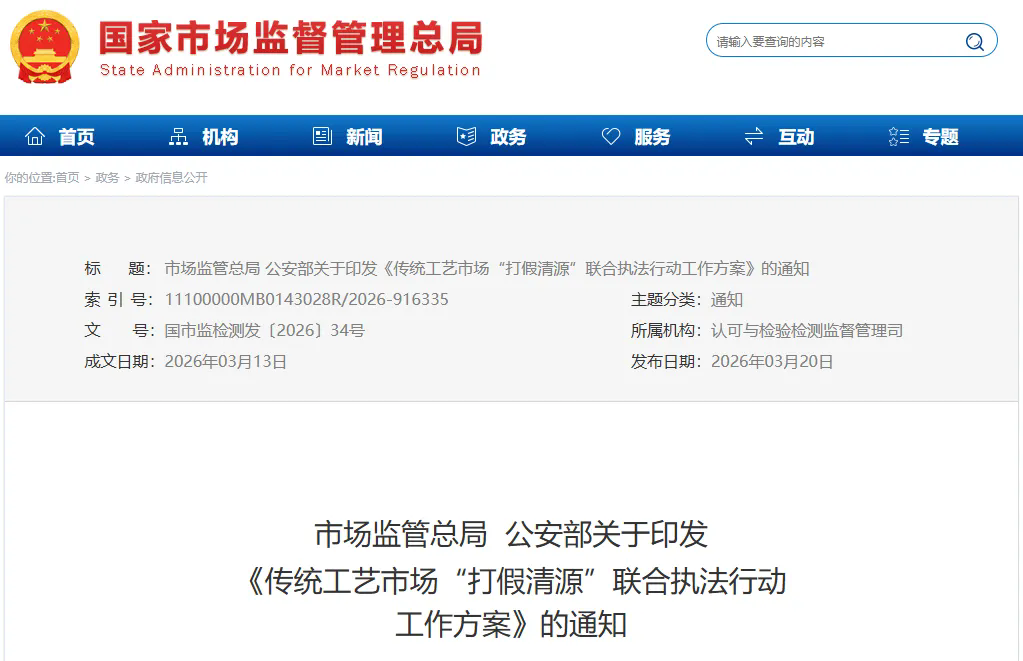 3月20日,市场监管总局官网发布市场监管总局、公安部关于印发《传统工艺市场“打假清源”联合执法行动工作方案》的通知。《工作方案》明确,组织开展对珠宝首饰等传统工艺品检验检测机构的专项监督检查,严厉打击超出资质认定范围、不按标准进行检验检测、伪造数据结果、出具不实、虚假检测报告等违法违规行为,依法从严处理,直至撤销资质;涉嫌犯罪的,依法追究刑事责任。全文如下: