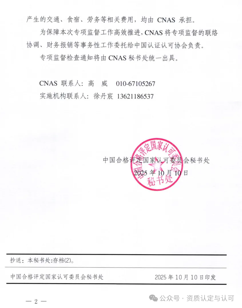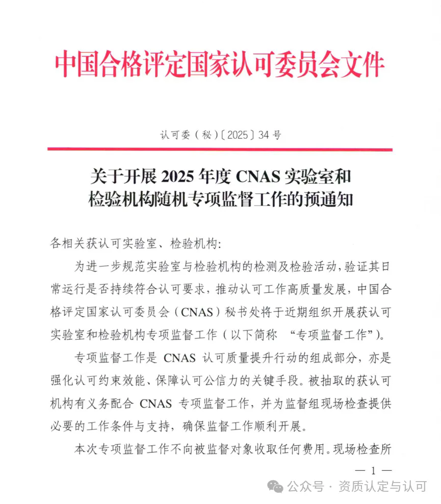 开展2025年度CNAS实验室和检验机构随机专项监督工作的预通知