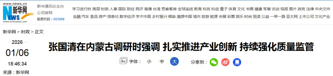 1月4日至6日,中共中央政治局委员、国务院副总理张国清在内蒙古自治区调研产业创新发展、质量监管等工作。他强调,要深入贯彻习近平总书记重要指示精神和中央经济工作会议精神,落实党中央、国务院决策部署,扎实推进科技创新和产业创新深度融合,因地制宜发展新质生产力,持续强化质量监管,更好服务高质量发展和高品质生活。
